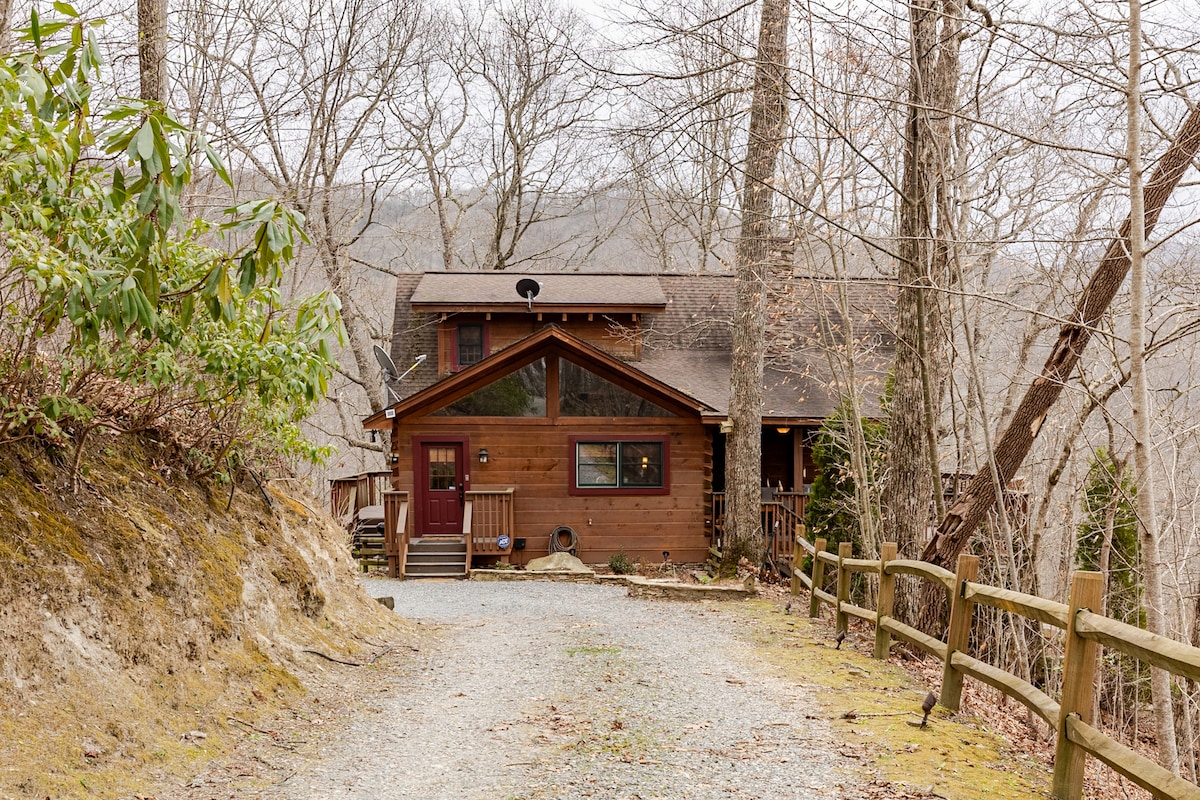 Si buscas una experiencia familiar en la montaña o una escapada romántica privada, has encontrado la cabaña perfecta. La cabaña se encuentra en 6 acres de bosque espeso y hermoso con vistas a las montañas y a la naturaleza. Te encantará sentarte en las mecedoras del porche cubierto o disfrutar de los sonidos de los arroyos naturales, mientras te relajas frente a una acogedora chimenea al aire libre o te desconectas en el jacuzzi mientras disfrutas de la paz y la belleza de las montañas de Carolina del Norte.