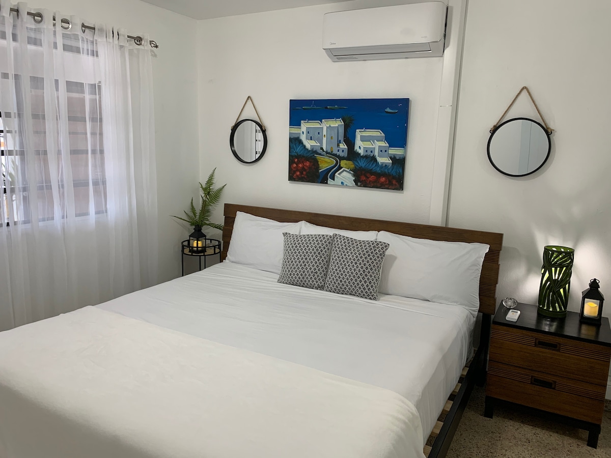 El departamento está ubicado en el centro de la ciudad de Rincón, con un amplio espacio de estacionamiento público, a poca distancia de la playa y a poca distancia de la plaza, donde puedes beber nuestro exquisito café, comer en el mejor restaurante y disfrutar de la mejor vida nocturna que Rincón puede ofrecer. Ven y déjame hospedarte y quedarme en Rincón donde todos los caminos conducen a la felicidad. Este apartamento tiene dos habitaciones. La primera habitación es una acogedora cama tamaño king y la segunda habitación es una litera, la parte inferior es una cama de tamaño completo, la parte superior es una cama doble.