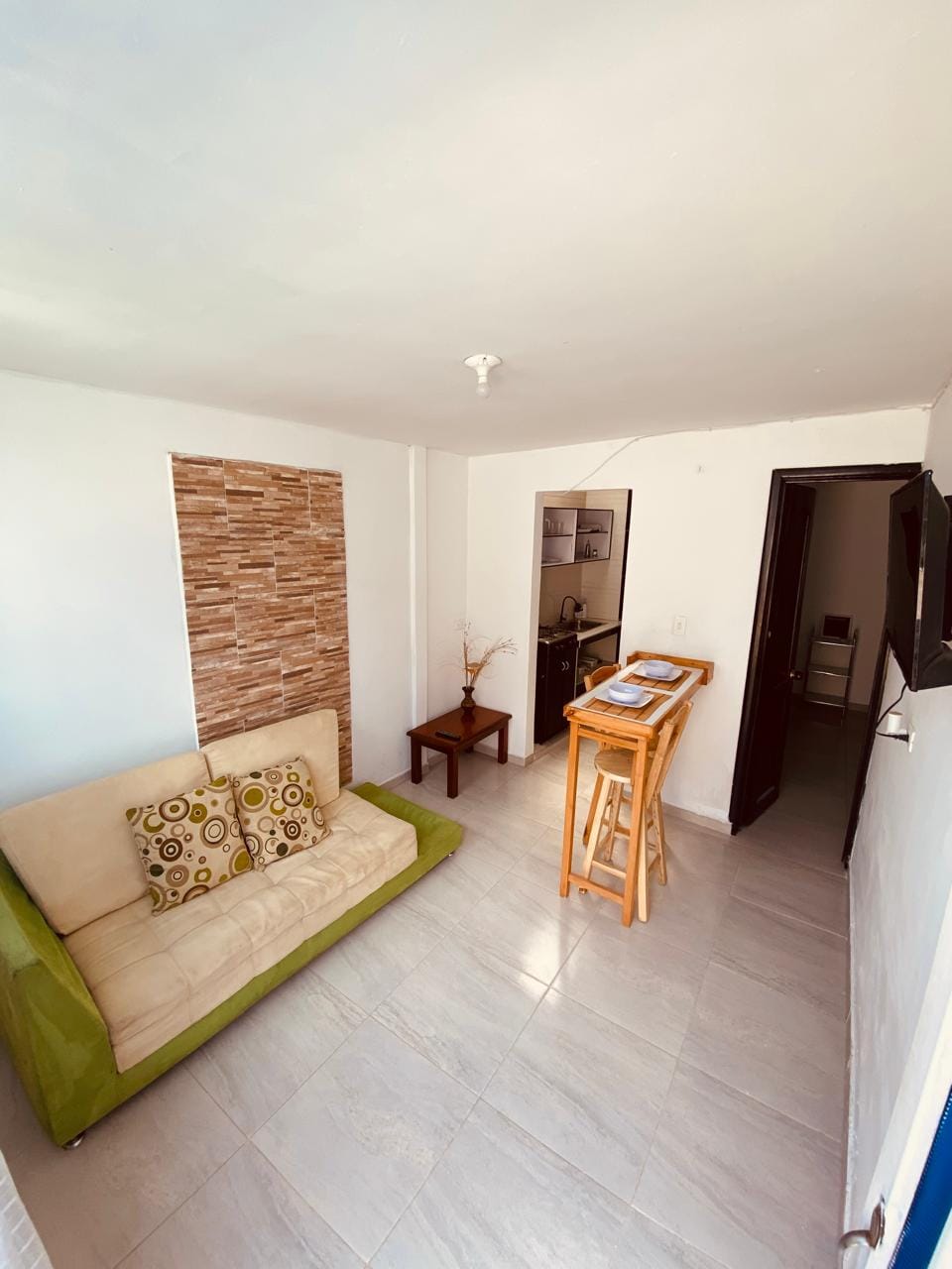 Apartaestudio totalmente privado e independiente. Ubicación céntrica Cerca de tiendas y supermercados A pocos pasos de restaurantes y servicios financieros Ideal para hospedarte para asistir a eventos de la región. Cerca al transporte público municipal. El espacio Habitación con cama doble, closet pequeño, baño privado con ducha de agua caliente. Sala con sofá y tv con circuito de TV, comedor estilo barra. Cocina con utensilios.