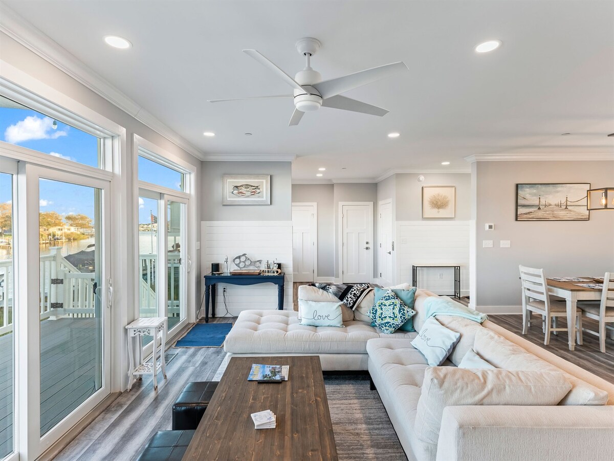 After relaxing at the beach (just a 7 min walk away), unwind on our deck "watchin' the tide rollin' away!" Get the best of the bay & the beach with this dog-friendly hidden gem! Imagine evenings enjoying the bay breeze as you crack crabs on the deck! Relax inside our open-concept great room that allows everyone to be together. Fish on our private dock or use it for your own boat or jet-ski to dock there. Witness spectacular sunsets with our Kayaks. Enjoy a well lit, private work space to virtual work w/ high speed internet! A new wood CRIB now in master suite for restful sleep! The pools and tennis/pickleball courts are only a few blocks away for your enjoyment! Plus, a truly unique OUTDOOR MOVIE EXPERIENCE for all our guests to make for the best Vacay EVER!