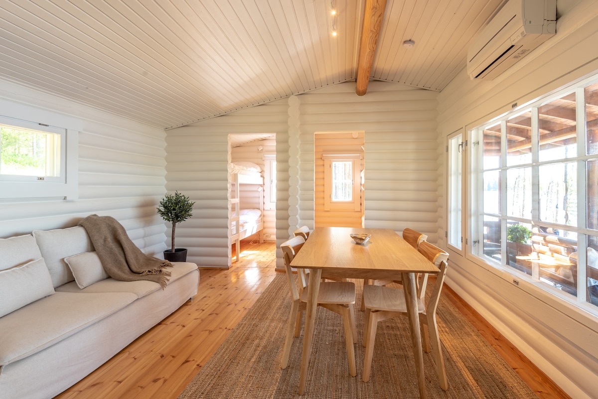 Esta acogedora cabaña te da la bienvenida para pasar escapadas relajantes y estancias de trabajo a distancia más largas en medio de la hermosa y tranquila naturaleza finlandesa. La cabaña tiene dos espaciosas cabinas, una cocina bien equipada y una buena sauna. El encantador estanque para nadar está a solo unos pasos y escaleras de la cabaña. Hay buen wifi, un gran césped soleado y no hay vecinos a la vista, por lo que puedes nadar en tu traje de cumpleaños si quieres :) La tienda de comestibles más cercana está a 12 minutos en coche.