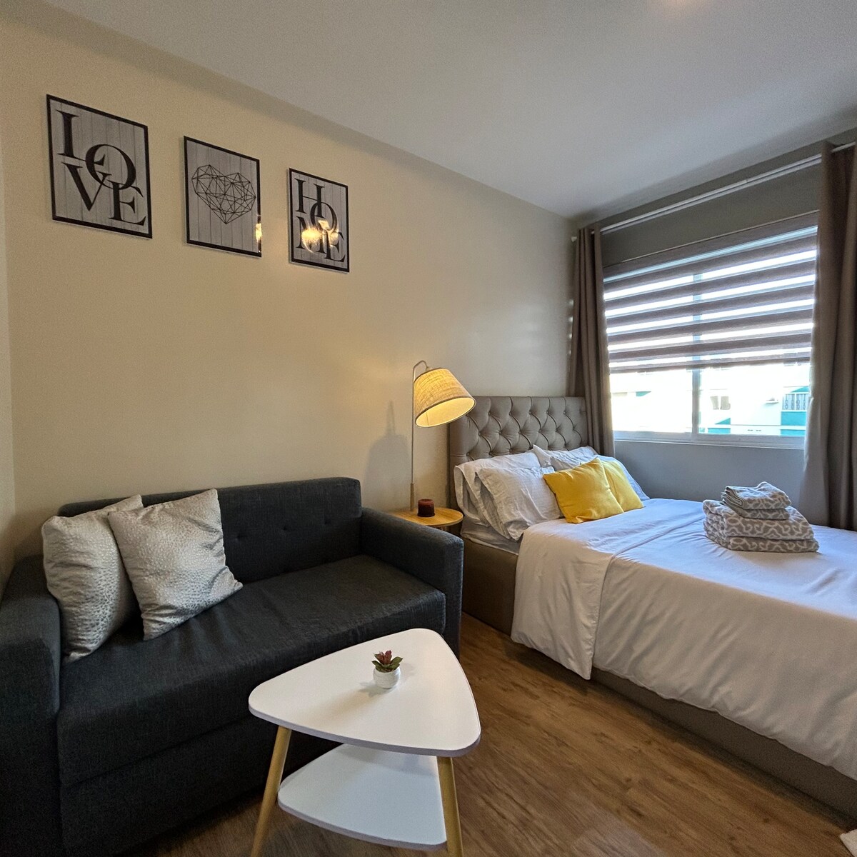 Bienvenido a una moderna unidad de diseño nórdico ubicada en la terraza de la azotea con impresionantes vistas a las montañas. Este lugar minimalista es el lugar perfecto para relajarse, descansar y disfrutar de una escapada como ninguna otra. La ubicación es muy accesible, el edificio está ubicado a lo largo de la carretera de Sta. Rosa - Tagaytay. Si decides quedarte en casa, solo tienes que acostarte y encender la televisión durante todo el día. También puedes dejar las ventanas abiertas y dormir toda la noche con una brisa tan fresca.