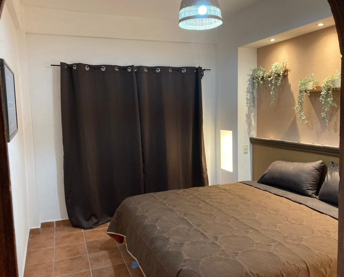 Ofrecemos un espacio para dos personas en una hermosa casa en medio de la vegetación. Tendrás privacidad y unos amaneceres hermosos. El estudio cuenta con una terraza privada perfecta para tomar un café por las mañanas. Tiene TV, una pequeña cocina y un espacio de trabajo para que puedas continuar conectado durante tu estancia. Con cama king size y un sofá cama para la tercera persona.