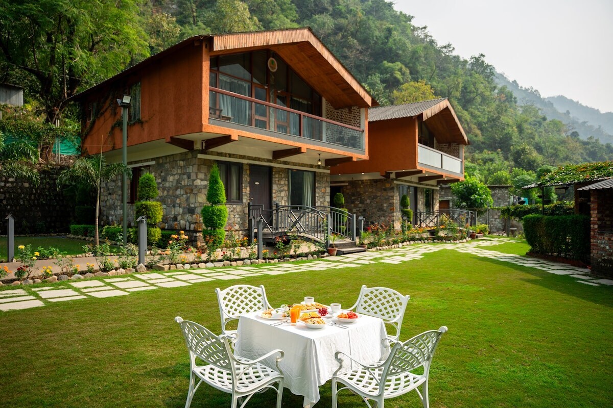 Set along a serene river at a peaceful, pet & senior-citizen friendly resort, this 2-bedroom suite features large glass windows and private balconies that frame picturesque river and mountain views. Outdoors, guests can unwind amid landscaped gardens, riverside seating, a gazebo, a cabana, and a shared pool with a dedicated kids’ pool. Delight in delicious meals at the on-site restro, which offers thoughtfully designed indoor & outdoor seating, ideal for intimate meals immersed in nature.
