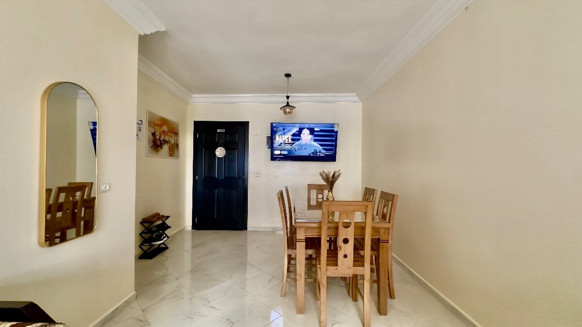 ️‼ LEER ANTES DE RESERVAR: Apartamento reservado para familias y parejas casadas (no se aceptan parejas no casadas ni grupos de amigos). Moderno y totalmente equipado en Témara/Skikina: 2 dormitorios, 2 salones, cocina, comedor, 1 baño, 2 aseos. Wifi de fibra, TV de 75'' (IPTV/Netflix), aparcamiento. Barrio tranquilo y seguro, cerca de la estación de tren, playas y tiendas. No se permite fumar, animales ni fiestas. Check-in 16:00 / Check-out 11:00.