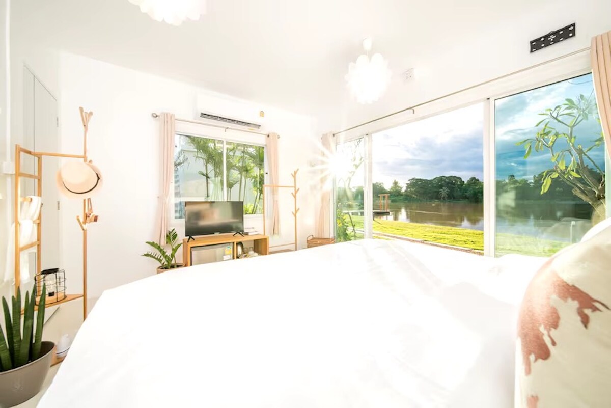 Imagine stepping into a stunning room with panoramic views of a serene riverfront. Nestled on the banks of a tranquil river, this room boasts a unique feature: a skydeck that offers an elevated perspective of the surrounding natural beauty. The combination of modern luxury and nature's splendor makes this space a perfect retreat for relaxation and inspiration.