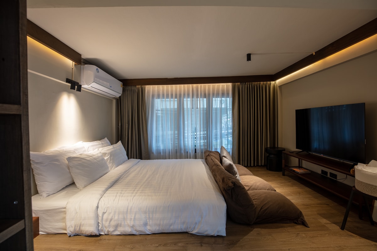 This compact and fully equipped studio apartment features a King size soft bed & a sofa bed (150cm wide) allowing it to accommodate up to 4 people comfortably. It features a fully equipped kitchen, dedicated work desk with ergonomic chair, cozy lounge with sofa chairs, and a 50-inch Smart TV. Enjoy modern comforts like air conditioning, hot water, and high-speed Wi-Fi, plus access to Villa Lila’s pool & gym!