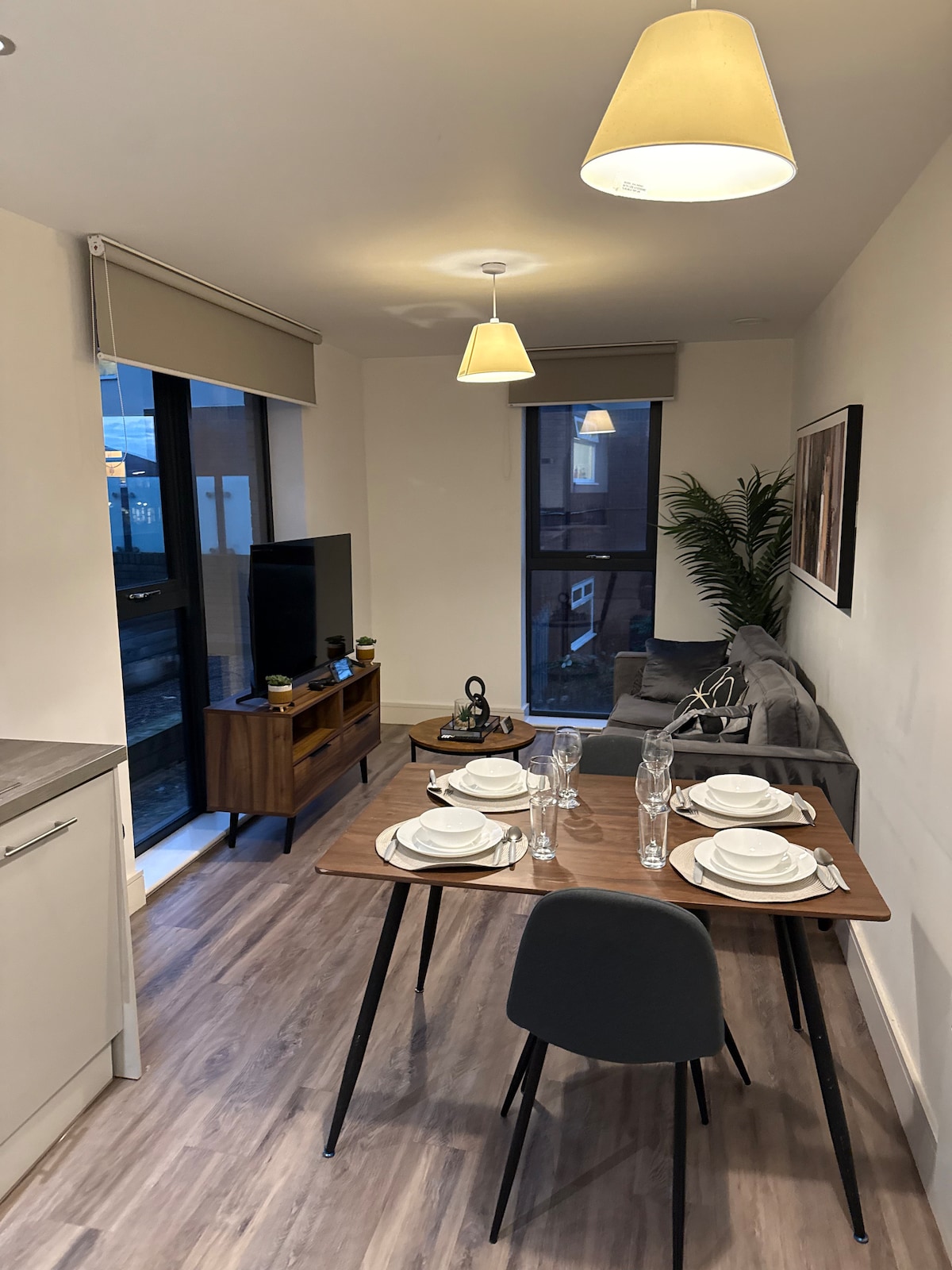 Experience comfort and convenience in our spacious apartment, located in the heart of Media City, Salford Quays. Whether you're here for business or leisure, here’s what makes our place special: -Prime location near MediaCityUK with great transport links to -Manchester City Centre -Stylish open-plan lounge and dining area -Accommodates up to 6 guests -Smart TVs for your entertainment -Stunning views of Manchester’s skyline -Ideal for both corporate stays and getaways