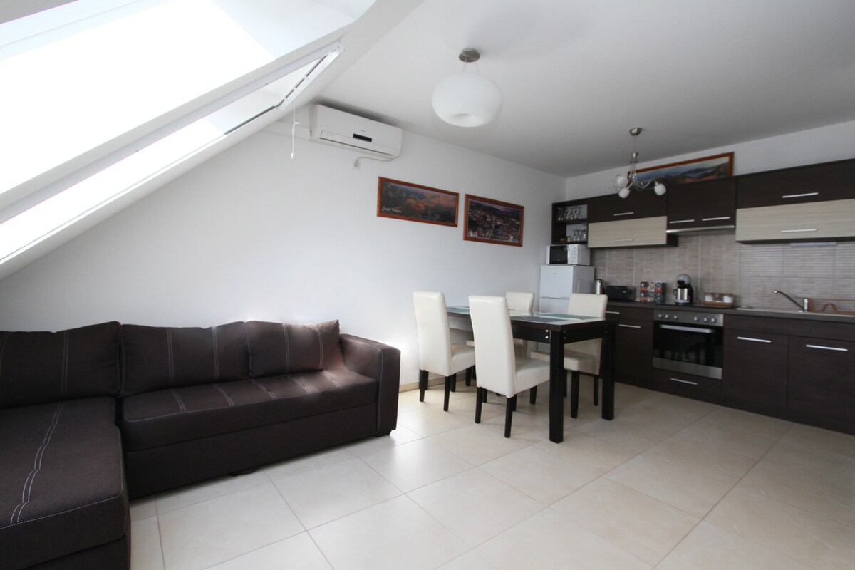 Newly built, spacious, ground-floor apartment close to the city center, in a quiet street. 1 bedroom, living room, open kitchen. Free parking. It is 15-minute walk from Dóm Square and from the Clinics. Tram and bus stops are in the next street. The apartment is 50 square meters, fully equipped: cooling-heating air conditioner, underfloor heating, dishwasher, washmachine, cozy terrace. Free Wifi, TV service. Maximum 4 person can stay in the apartment.