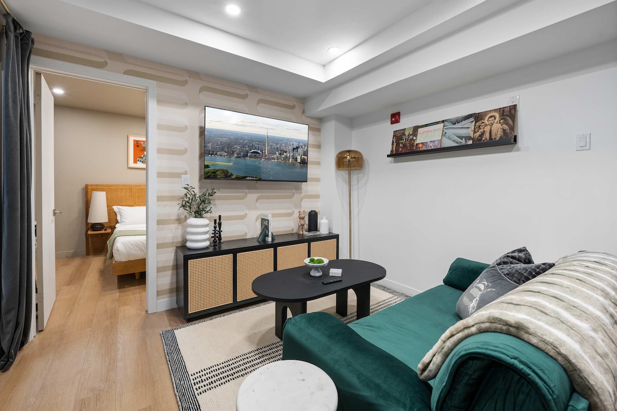 Relájate en esta luminosa suite de 2 dormitorios apta para mascotas en el vibrante Leslieville de Toronto. Rodeada de cafés independientes, tiendas locales y fácil tránsito, esta joya urbana ofrece una cocina completa, un acogedor salón con sofá cama y Smart TV de 55", además de un dormitorio King y Queen, perfecto para hasta 5 personas. Disfruta de la comodidad durante todo el año con un aire acondicionado portátil para refrescarte aún más. Una base elegante para explorar la ciudad como un lugareño. ¡Reserva tu estadía hoy mismo!