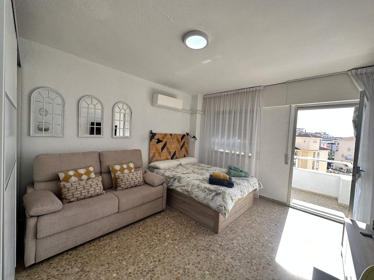 Estudio frente a la playa con vistas al mar, parque acuático y balcón