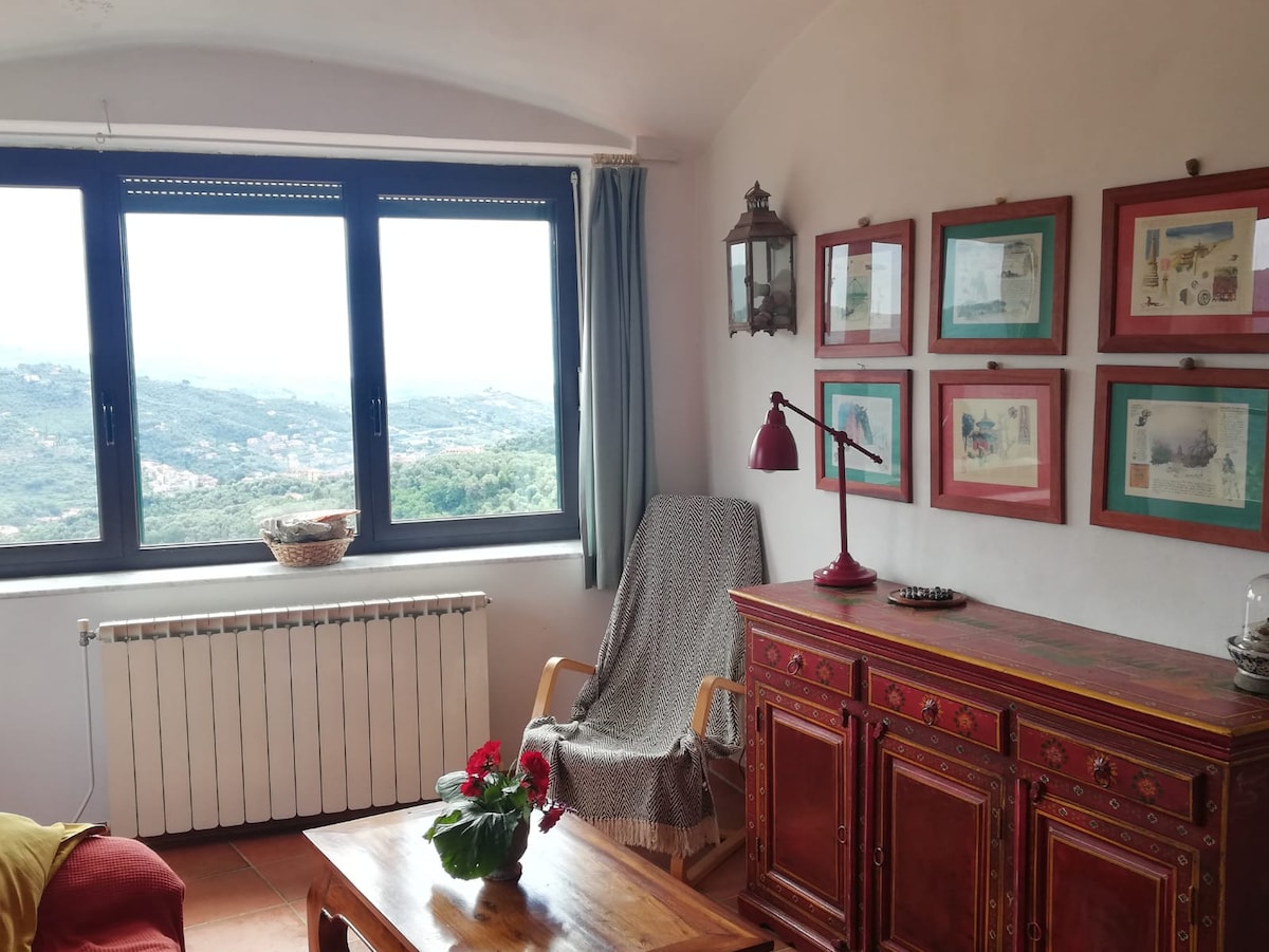 En un tranquilo pueblo histórico a 4 km del mar y del carril bici de la Riviera di Ponente, en la colina entre Imperia y San Lorenzo, este luminoso apartamento de dos habitaciones cuenta con una gran terraza con vistas al mar y a los olivos. Equipado con todas las comodidades, electrodomésticos y toldos eléctricos. Amplia sala de estar con sofá cama doble que se abre a la terraza a través de 2 ventanas francesas. Dormitorio doble con ventana francesa que da directamente a la terraza. Baño con ventana. Aparcamiento para coche, bicicleta o escúter en garaje privado.