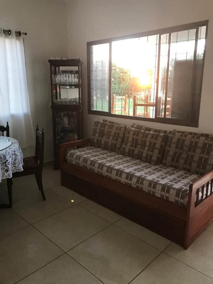 Cuenta con 4 suites, aire acondicionado, TV con Sky, piscina para adultos (con calentador solar y calentador eléctrico) y piscina para niños, sala de estar con barbacoa y mesas de juego (billar, ping pong, futbolín), cancha de fútbol, cancha de voleibol, viveros de aves acuáticas y exóticas, amplio césped y un amplio estacionamiento. La zona tiene mucho verde, aire puro y tranquilidad. Estamos ubicados a 10 minutos de la ciudad de Olimpia, donde a la llegada a la ciudad hay un mercado y una panadería.