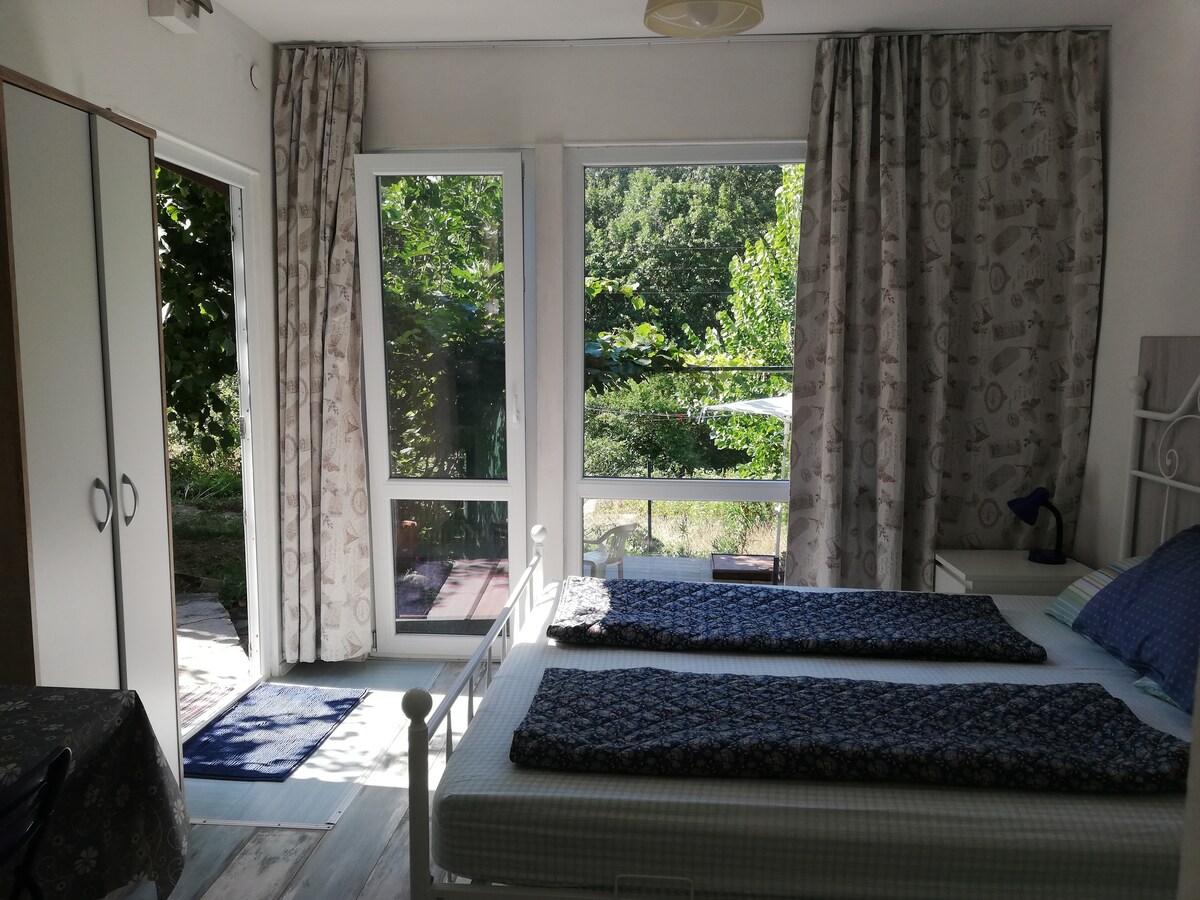 Pequeña casa familiar con bonitas vistas al jardín y al bosque de robles. Pequeña zona de cocina, adecuada para familias con un niño. Alrededor de la casa se pueden ver tortugas, erizos y otros animales salvajes, y escuchar pájaros increíbles.