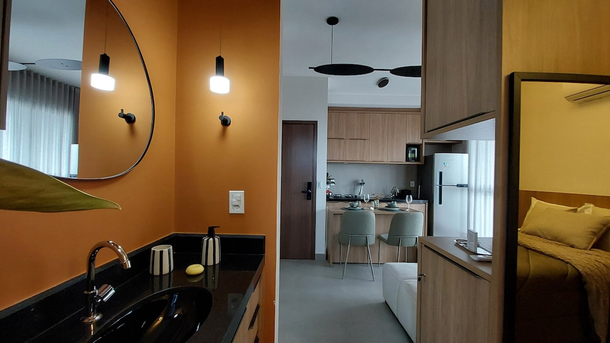 Studio Duna ofrece una cocina equipada con cápsulas de café como regalo, una sala de estar con SmartTV y aire acondicionado, un baño completo y un dormitorio con una cama doble. Ideal para un máximo de 3 personas con ropa de cama incluida, cada detalle está diseñado para que te sientas como en casa, o más bien, en una casa con un toque de hotel boutique. Excelente ubicación: a 3 minutos de la UFU, a 5 minutos del centro comercial y cerca de las avenidas Rondon Pacheco y João Naves. Check-in digital y plaza de garaje.