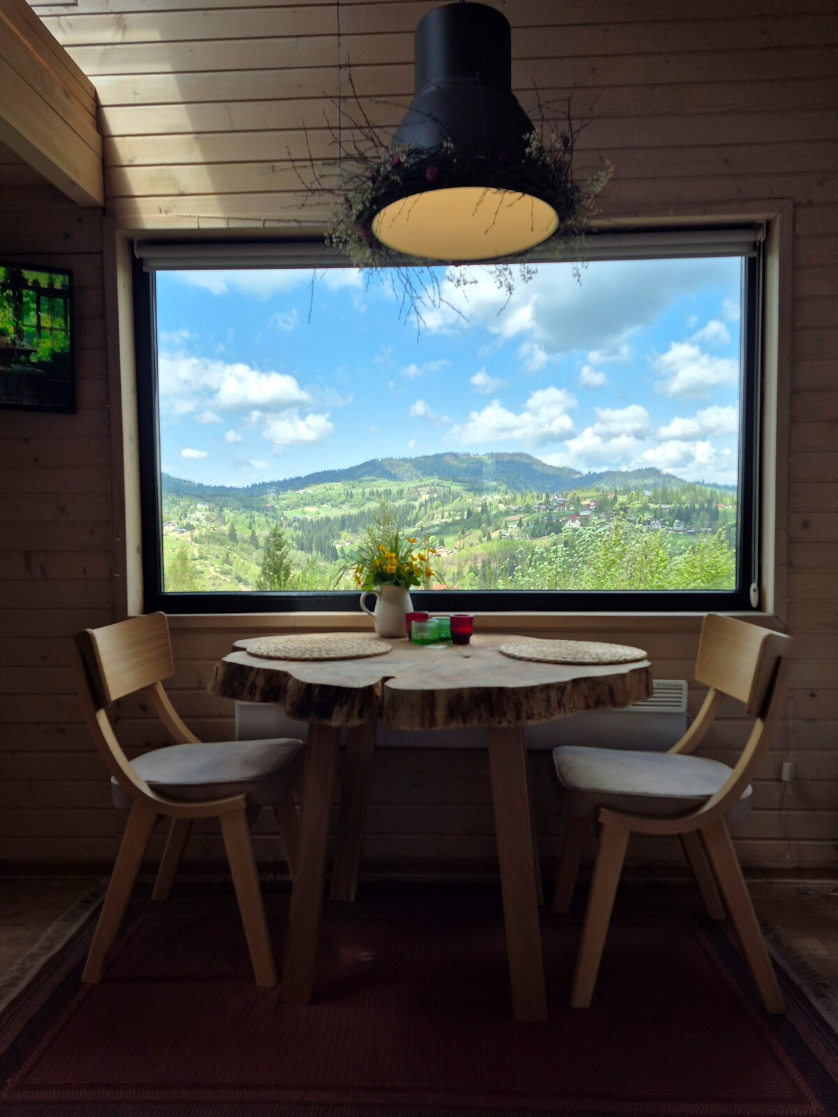 Ticho es un espacio único ubicado en la cima de una montaña. Está rodeado de vistas increíbles: Hoverla, Petros, Dragobrat, picos que se pueden ver directamente desde la ventana. Debido a su ubicación remota, intimidad y ambiente especial, unas vacaciones en TiHo se convirtieron en una verdadera experiencia de reinicio para personas de diferentes partes de Ucrania. Hay tres casas en el territorio del espacio: una cabaña de retiro, una pequeña casa de granero y TyHo hutka, esta es la que alquilamos, y esta es la que ves en la foto.