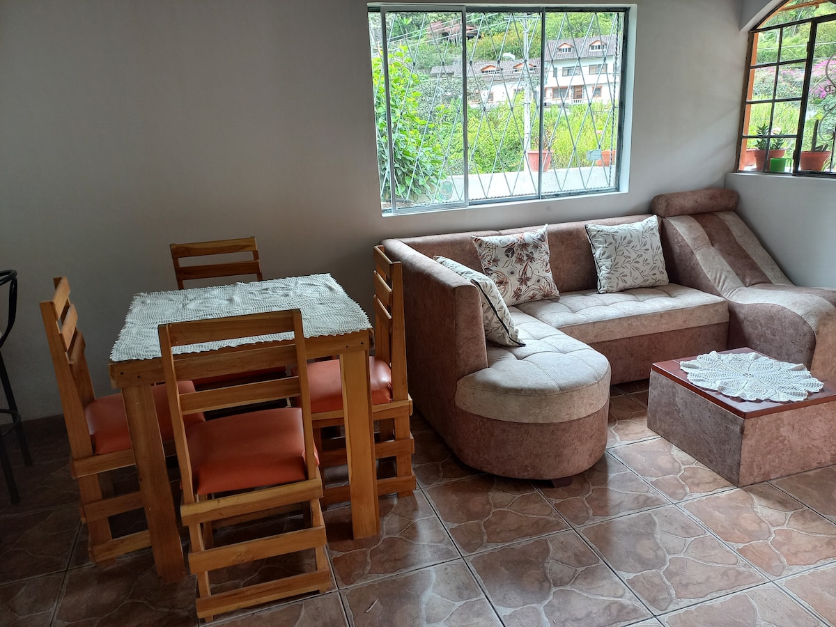 Disfruta de una estancia cómoda en la Zona Rosa de Baños, a 3 cuadras del centro y 2 ½ del terminal. La suite ofrece Wi-Fi rápido, TV Box, lavadora, cocina equipada y terraza compartida. En un sector animado con bares y cafés cercanos, puede haber algo de música en la noche. Ideal para parejas o viajeros solos, combina confort, ubicación y practicidad, también apta para estadías prolongadas. A pocos pasos de las termas y miradores.