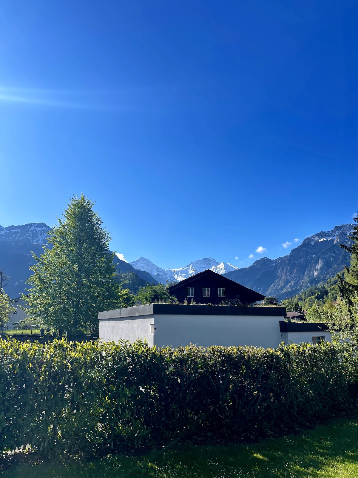 Our apartment is located in the heart of the Swiss Alps in the city of Interlaken just beside the hospital. The view from our place is unbeatable. You can see the famous, Eiger, Mönch, and Jungfrau Mountains from our balcony. The apartment also looks over the Aare River that runs in between our two clear blue glacier lakes. The neighborhood is a nice and peaceful one located just a short walk away from the town center. The apartment occupies the top floor of our home. Children not allowed.