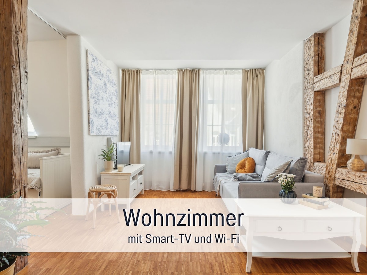Apartamento tranquilo (42 metros cuadrados/452 pies cuadrados) en la zona peatonal, con cocina americana, baño grande con ducha, terraza, espacio de estacionamiento. Equipo: TV, WiFi rápido, calefacción por suelo radiante (verano: refrigeración por suelo radiante), cama tamaño queen (1,60mx 2,00m), sofá cama adicional, mesa de comedor, escritorio, cocina pequeña con nevera, microondas, hervidor, mini horno, vitrocerámica, cafetera Senseo, platos, vasos, cubiertos, utensilios de cocina. SERVICIO DE LIMPIEZA una vez a la semana/ cada 2 semanas (dependiendo de la duración de la estadía) INCL.