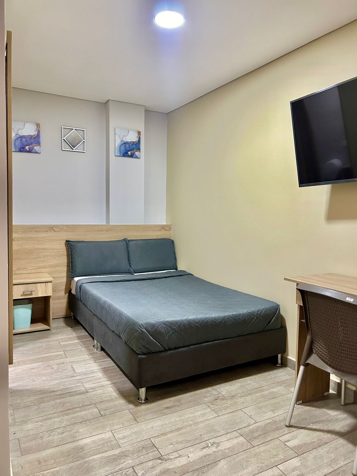 Este acogedor apartaestudio es de uso exclusivo, independiente y privado consta de una habitación amplia, con una cama doble, TV, clóset y mesa de escritorio, baño con agua caliente y una cocineta con nevera la cual tiene lo necesario para cocinar como ollas, loza, cubiertos y otros adicionales. El apartaestudio se encuentra ubicado en la parte de atras de la casa principal, por lo que la entrada es compartida entre ambos. El apartaestudio tiene una buena iluminación, es muy limpio y acogedor