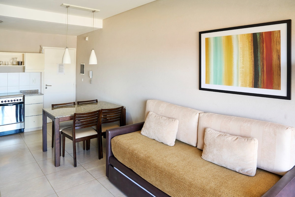 Monoambiente muy luminoso SOBRE LA PLAYA,dentro de un complejo con amenities. Capacidad máxima: 2 adultos y un niño Se accede por ascensor, y un piso por escaleras Incluye el servicio de limpieza, toallas y sábanas. Cuenta con una cama dos plazas y un sofá cama para un niño pequeño. WIFI Cochera ext. semi cubierta. Piscina interior climatizada y dos exteriores (en temporada alta) No cuenta con parrilla