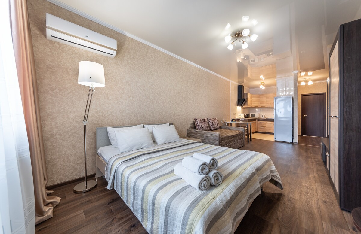 Apartamento elegante y acogedor con balcón que da a un patio tranquilo. El apartamento tiene muebles nuevos, una cama doble, un sofá para descansar, una mesa de comedor y una cocina equipada con todos los electrodomésticos y utensilios necesarios para cocinar. El elegante cuarto de baño está equipado con una moderna cabina de ducha. Dos televisores de plasma e Internet de alta velocidad para el trabajo y el entretenimiento.