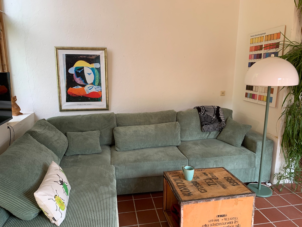 Apartamento Hankhausen con aspectos ecológicos. El yeso de arcilla y las baldosas de terracota forman la base de un apartamento acogedor. El departamento está en el piso superior, abajo vivo yo y mi pareja. El baño está equipado con una sauna y tiene un toque asiático. Apartamento para no fumadores. El primer/segundo supermercado está a solo 1 km. Hay un estacionamiento disponible en las instalaciones.