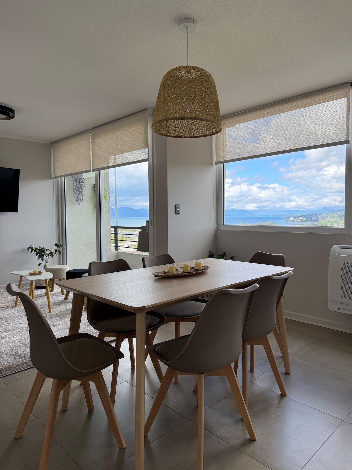 Disfruta de una estadía tranquila y céntrica, con vista al lago y volcán. Departamento completamente equipado, solo necesitas traer tu ropa, y comida, del resto ya nos hemos encargado para que su estadía sea lo más grata posible y que la única preocupación sea elegir desde cuál de las dos terrazas disfrutar la vista. Ubicado a solo cinco cuadras del centro y diez minutos de la costanera caminando.