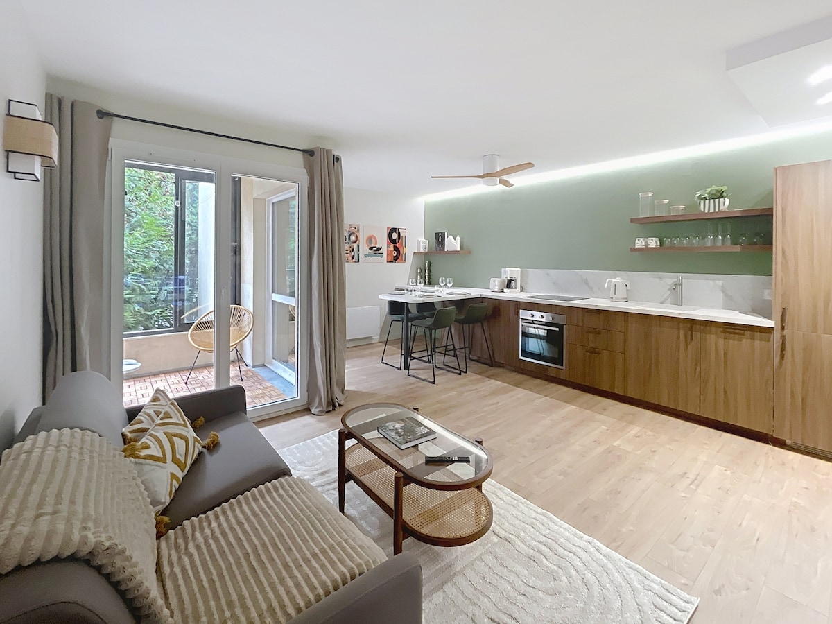 Alojamiento entero luminoso de 35 m2 con encanto estilo hotel en un edificio nuevo de alto standing totalmente seguro (videovigilancia en el edificio). Alojamiento completamente nuevo, dispone de un sofá cama (suplemento a partir de 2 personas), TV, wifi, cocina equipada (vitrocerámica, horno, microondas, nevera, congelador, vajilla incluida), Nespresso. El baño completamente nuevo dispone de una gran ducha con normas para discapacitados. La habitación dispone de una cama de 140 x 200 cómoda para dos .