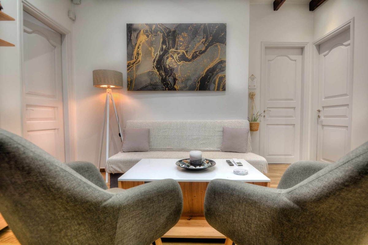 El apartamento está en el segundo piso de una casa independiente que incluye una sala de estar con chimenea y un minibar,una cocina totalmente equipada,un baño y un dormitorio grande con un jacuzzi en el interior. ¡Ideal para parejas! También hay un gran balcón con una vista fantástica de la ciudad de Corfú y los suburbios. La distancia desde la ciudad de Corfú es de unos 2 km , del puerto a 3 km y a 2 km del aeropuerto. La estación de autobuses está a 5 minutos a pie . Alquiler de coches y bicicletas a buenos precios ,sin cargos adicionales. Netflix en la televisión
