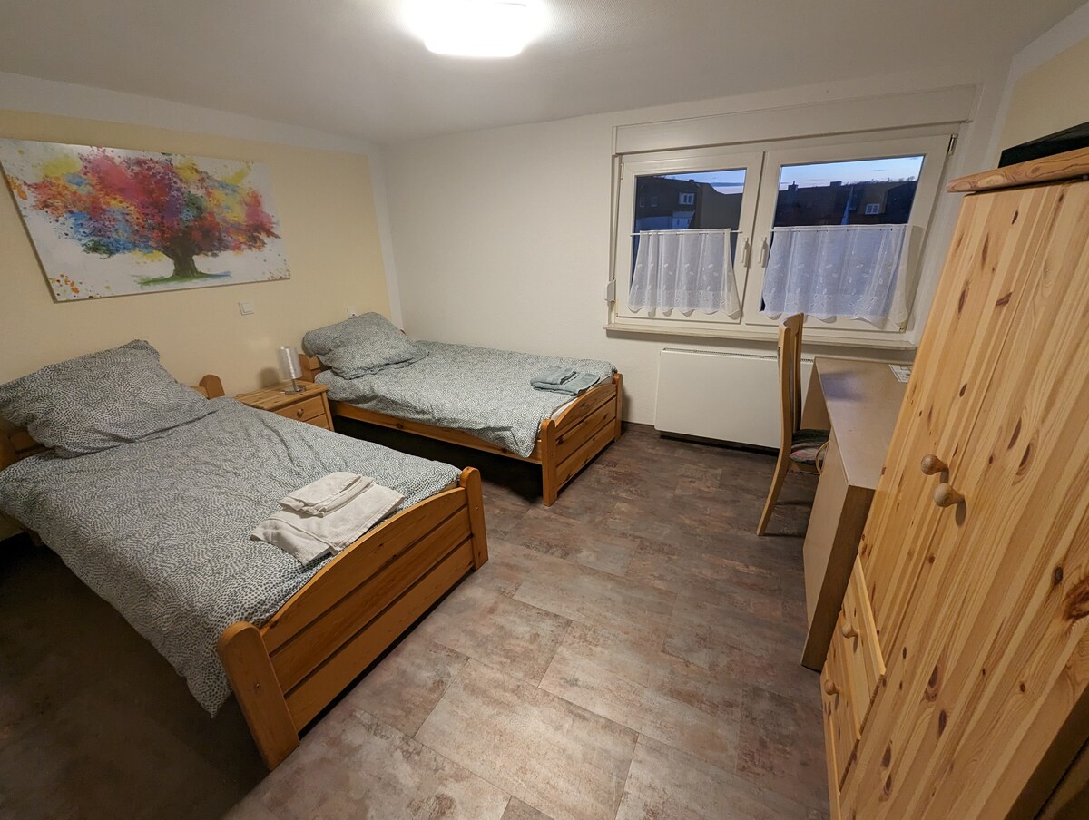 ZIMMER AKASYA - HABITACIÓN 101 Este elegante lugar está situado en el centro. A 5 minutos a pie se puede llegar a la estación de tren, un centro comercial, supermercados como Rewe, Dm, Aldi, etc. Las habitaciones están amuebladas y totalmente equipadas. Cada habitación tiene su propia cerradura, baño y cocina. Autoservicio, a pocos pasos hay varios restaurantes y cafeterías de desayuno. Habitaciones para no fumadores, terraza en la azotea muy grande con vistas al horizonte. Con calefacción por suelo radiante, edificio nuevo de 2024.