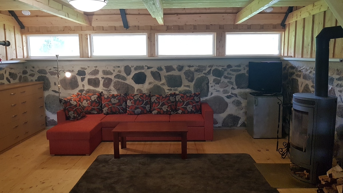 This two-story room features a fireplace, TV, refrigerator, and Wi-Fi. The living room features a large corner sofa that converts into two beds. The second floor sleeps six. You can prepare or order breakfast in the shared kitchen. The 65 sq. m kitchen is fully equipped. There's even a washing machine and dishwasher. The guesthouse has two more rooms, so you can share the kitchen with other guests. There's also a barbecue area outside. Bring the whole family! There's plenty of space for rest.