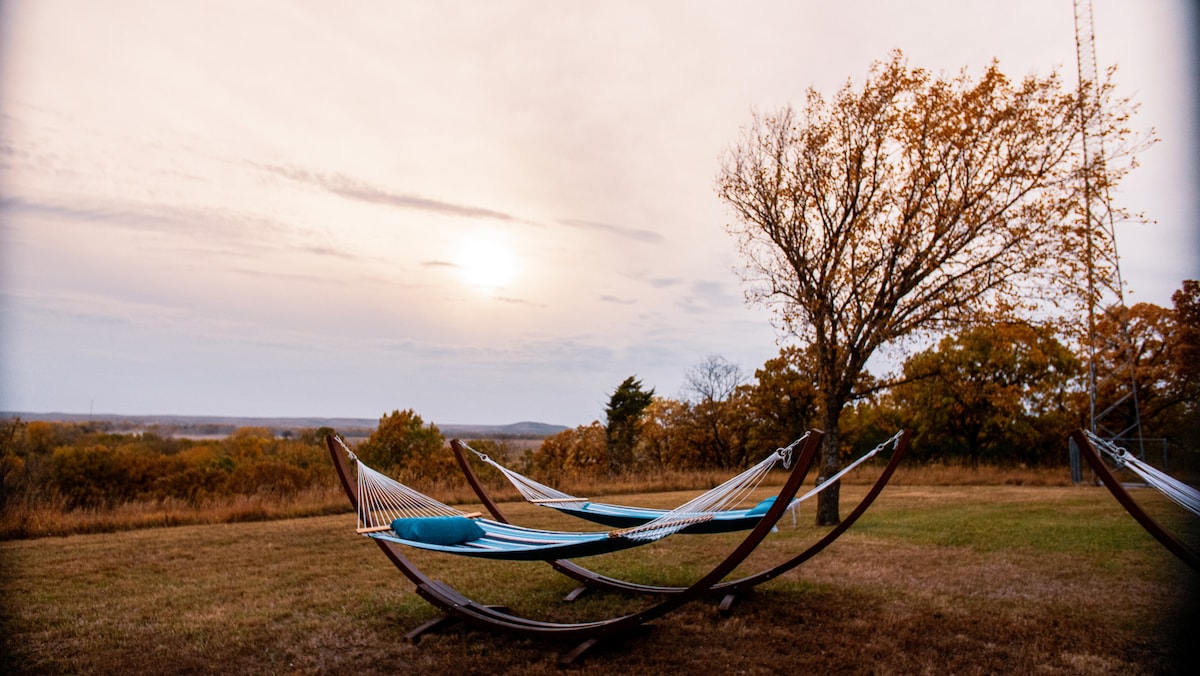 Nuestro remodelado estilo Farmhouse Glamper está a 15 minutos de Manhattan, KS y a 20-25 minutos del estadio de fútbol Bill Snyder Memorial de Kansas State. Coge un juego de Wildcat y luego dirígete a Emmons Creek y relájate o cocina una fogata alrededor de la fogata. O, si es un fresco día de otoño, explora la propiedad por las rutas de senderismo. El Glampsite se encuentra en un acogedor bosque de árboles sobre el estanque de la granja. Lo sentimos, no hay peces en el estanque... ¡todavía!