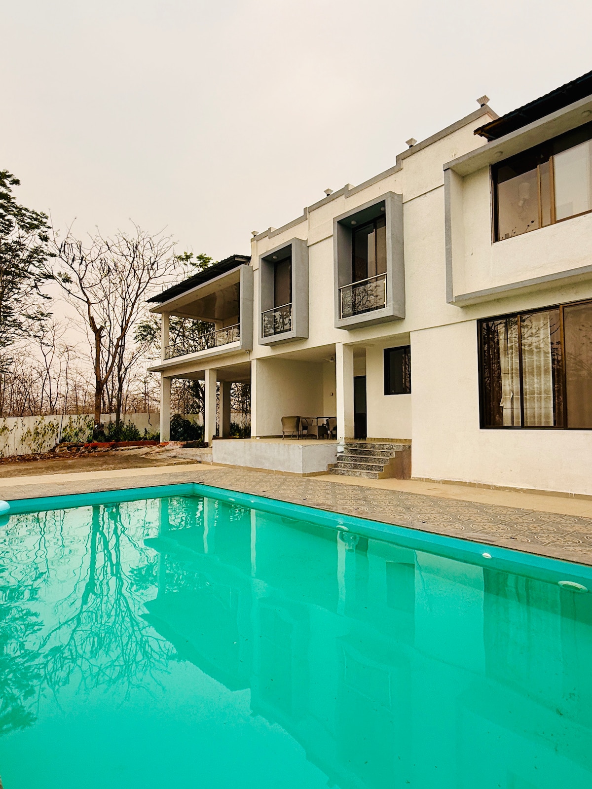 'Villa Elsewhere' es una lujosa y hermosa villa con piscina privada, a solo 60-90 minutos en coche de Bombay. Rodeado de exuberantes vistas verdes de campos, colinas y sonidos de la naturaleza. La villa tiene 3 dormitorios con aire acondicionado en suite, una gran sala de estar con aire acondicionado que se abre a una piscina privada y una gran terraza con un bar. La cocina está totalmente equipada donde un chef puede preparar comidas deliciosas (* cargo adicional). Se admiten mascotas (* tarifa adicional). ¡RESERVA para relajarte en un ambiente tranquilo, para una reunión o para organizar la mejor parte de la historia!