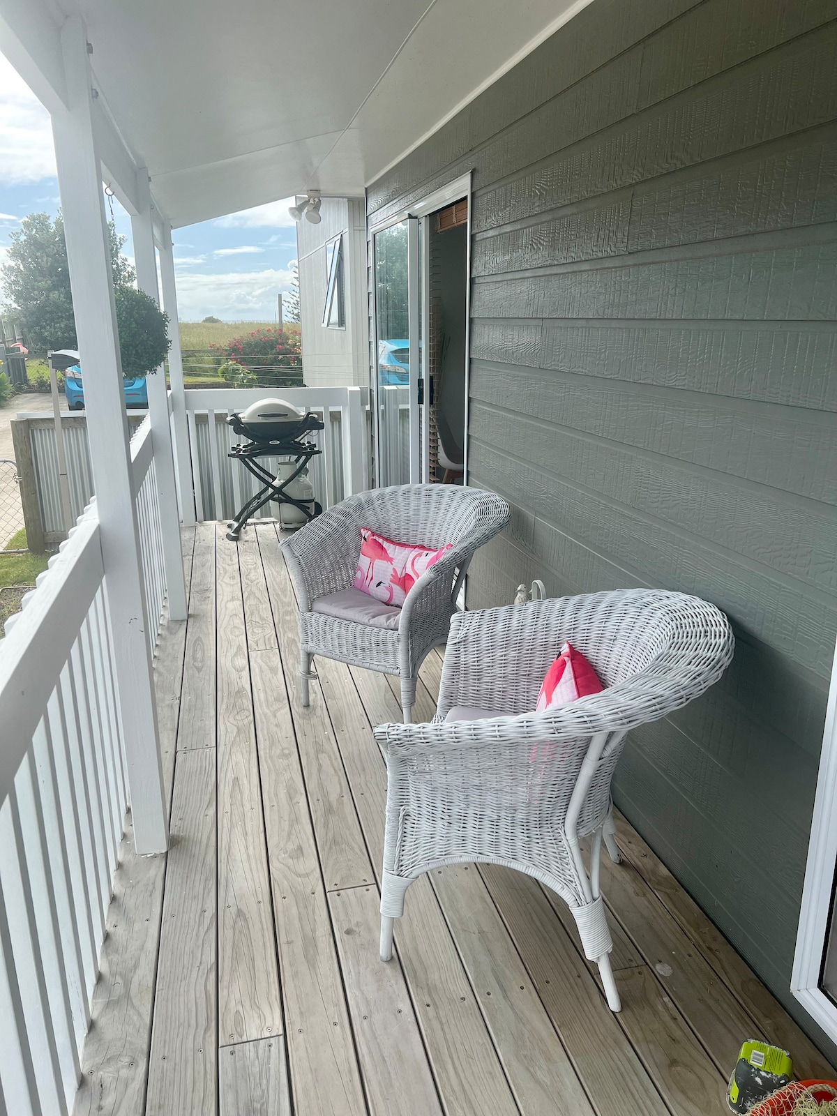 Our cute Bach is available for those looking for a break away from the hustle and bustle of busy life. Put the deck chairs out, relax on the decks and watch the world go by, or lace up your shoes & enjoy the many walks around the area. Shops 200m down the road, beach within throwing distance, your options are endless. Front room has a queen bed, the other has two singles and a double bunk with a single over it. Additional warm shower out the back to clean off the salt and sand is a real asset