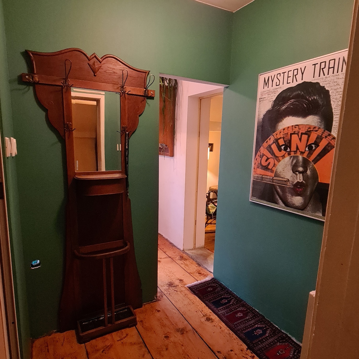 The offer is a 45m2 apartament with high ceilings, big windows and full concrete floor heating. The living room includes a comfy sofa, dining area, and wide kitchen, furnished with vintage wooden pieces and numerous plants. There is a separate bedroom with a double bed (160x200cm) and an extra mattress (140x200cm) up on the mezzanine in the living room. Spacious bathroom includes a bath.