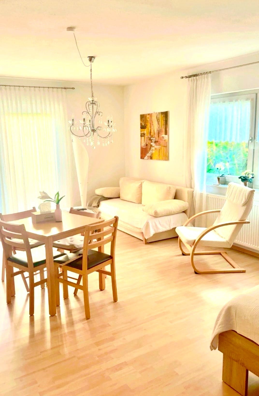 Gemütliches und liebevoll eingerichtetes Appartement in zentraler Lage von Sandershausen. Eine Bäckerei sowie Einkaufsmöglichkeiten sind in wenigen Minuten bequem zu Fuß erreichbar. Die Wohnung verfügt über einen privaten Eingang und einen Parkplatz direkt vor der Tür. Eine voll ausgestattete Küche mit eine barrierefreie Dusche, kostenloses WLAN sowie ein 55-Zoll-TV mit Streaming-Funktion. Zusätzlich steht ein Schreibtisch mit Stuhl zur Verfügung – ideal für Urlauber und Geschäftsreisende.