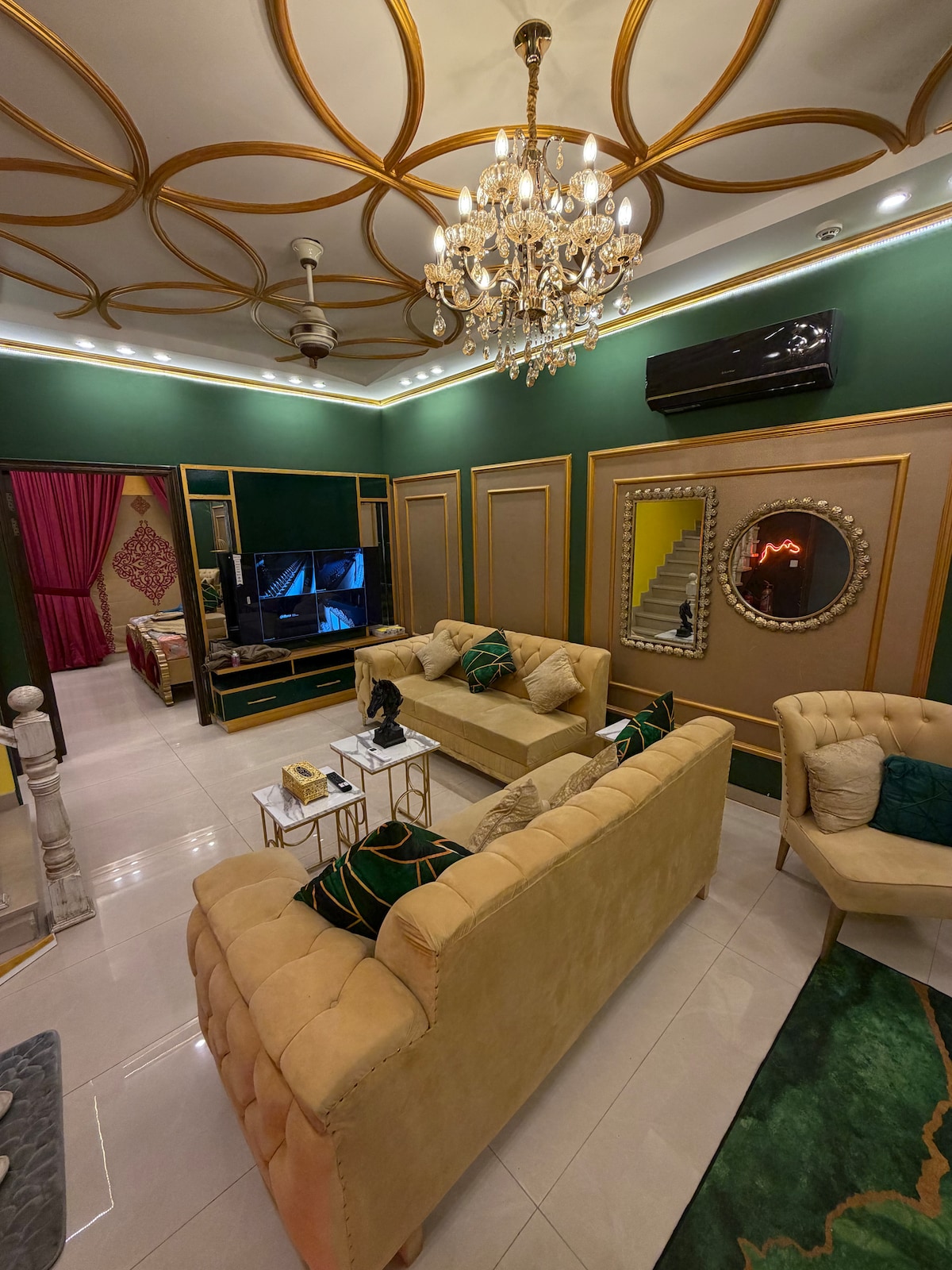 Our 1 BHK Orbit Penthouse in DHA Phase 5 is where urban chic meets celestial cool. Think: a glowing moon wall for those late-night selfies and a bold dollar-stacked art piece that screams "main character energy" Wake up to park views from your private balcony swing, binge your faves on the 50" 4K Smart TV, or cook up something aesthetic in the fully loaded designer kitchen. The interiors? Abstract, stylish, and made for the feed. Plus, you're right next to Lahore's hottest dining spots.