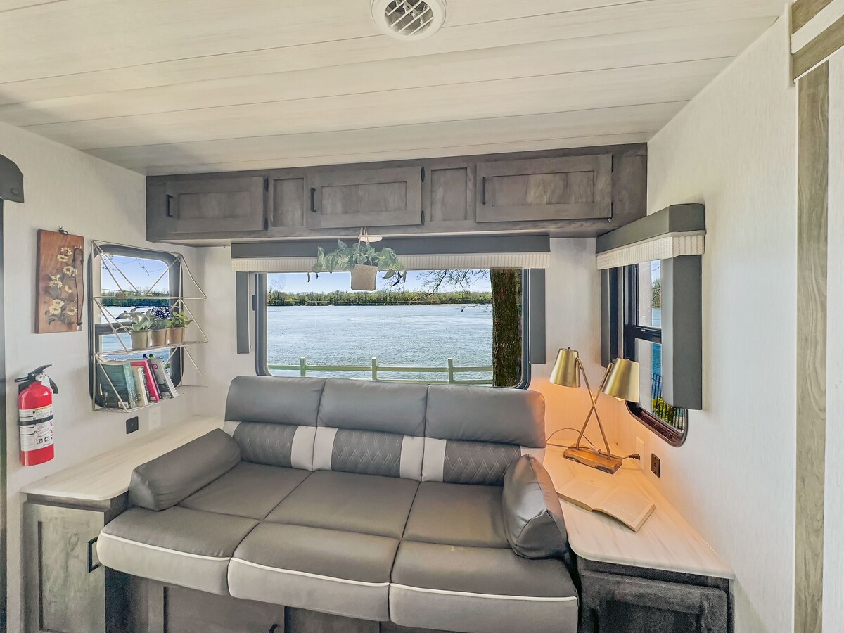 Cuando anhelas un poco de tiempo de inactividad, ¡este es el lugar ideal! No olvidarás los tranquilos alrededores de este refugio frente al mar. Comunidad privada y cerrada; muelle personal para tu placer de pesca; acceso a la rampa para barcos; observación de barcazas y observación de aves solo por diversión. Caravana completa con cama tamaño king y un sofá cama doble con colchón de aire. Además, dos sillones reclinables increíblemente cómodos.