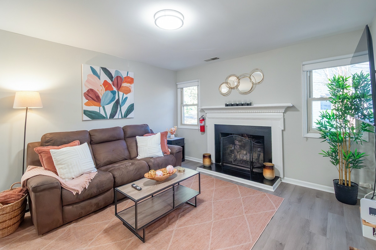 Dúplex de mediados de siglo a nivel de calle (2400 pies cuadrados) con entradas privadas en un acre completo en el centro de restaurantes y tiendas de Fort Mill. Chimenea de piedra interior; terraza exterior con fogata; jardín; lavadora y secadora; pianos; solárium; cocina con encimeras de cuarzo. Amplio aparcamiento; columpio en el porche delantero; zonas naturales al aire libre. Puede acomodar pequeñas reuniones, Scouts y equipos con aprobación. A 1 cuadra del centro Walmart y restaurantes. Carowinds a 8 millas; acceso al Velódromo/Río Catawba en Riverwalk a 4 millas.
