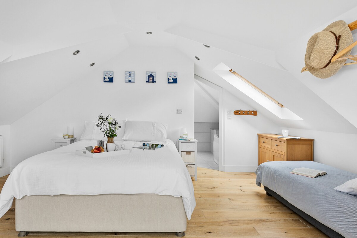 Dormitorio con baño en la planta superior en una ciudad tranquila.