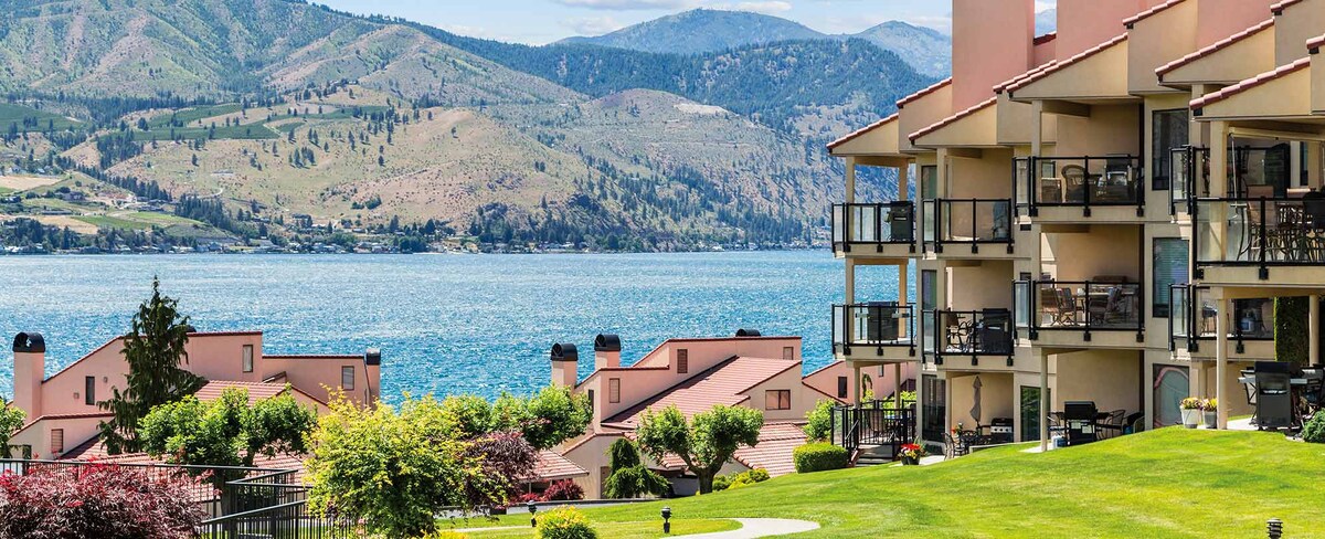 Chelan Resort Suites #411 It is located within a 3 minute walk to a lovely swimming beach and picnic area at "Lakeside Park" located in front of the building. It is 2 miles from downtown Chelan, minutes to Slidewater's Water Park, wineries and restaurants. Relax on the balcony where you can enjoy the lake & mountain views, the 4th of July and New Year's Eve fireworks. Enjoy relaxing in the in door on site pool and hot tub. Fully stocked kitchen, fireplace and washer and dryer.