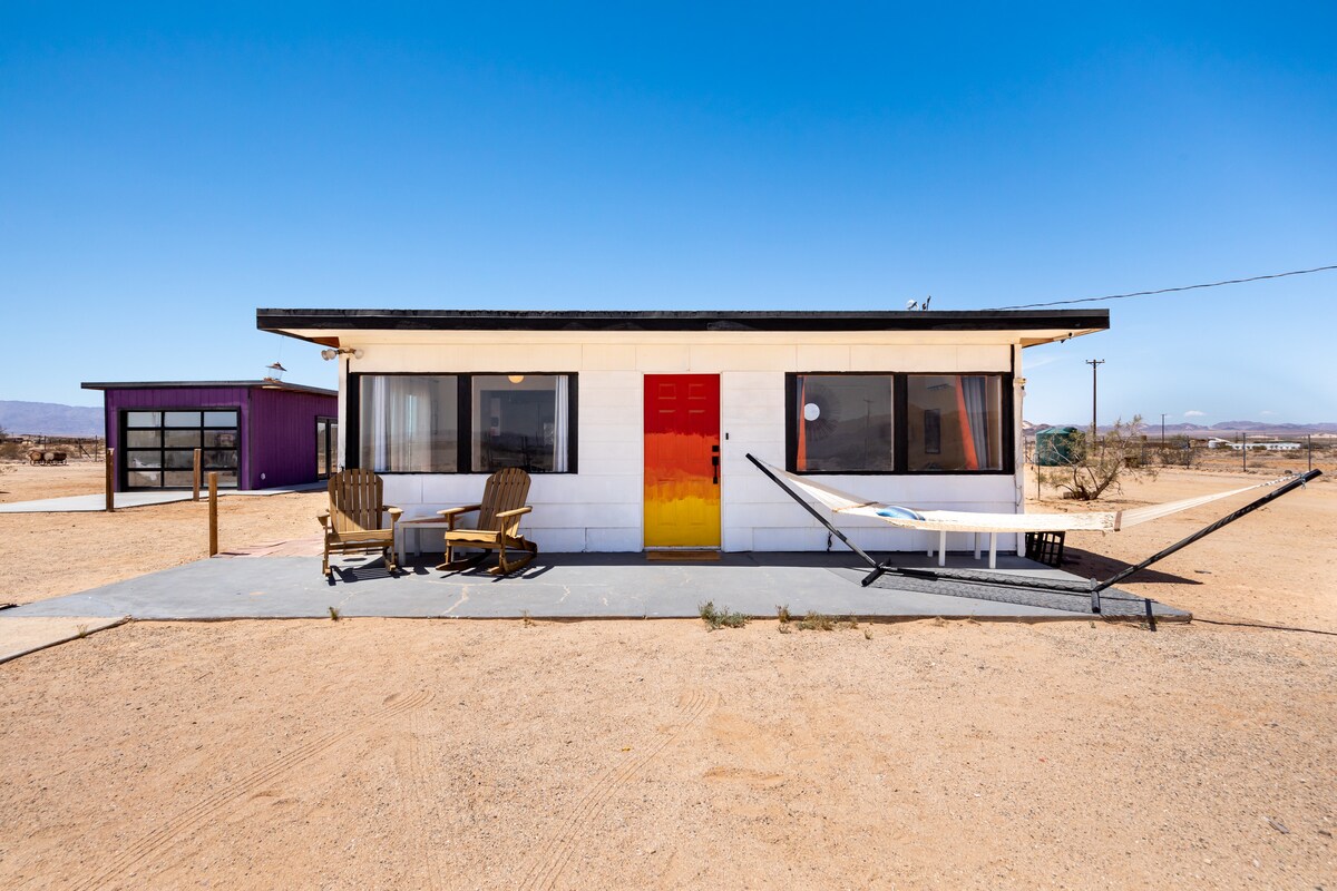 Sumérgete en la serenidad en este retiro aislado en el desierto a 25 minutos de la nueva entrada de JoshuaTree NP. Este ASOMBROSO remodelado de 1959 se encuentra en 5 acres vallados de tranquila tierra desértica y ofrece majestuosas vistas del desierto, las montañas y las ESTRELLAS. Casa con cama tamaño king de 2b/2b con una sala de juegos/edificio de salón independiente. Acurrúcate junto a la chimenea, sumérgete en el jacuzzi/piscina, tómate un café o tómate un cóctel de los patios cubiertos. Trae a tus seres queridos y prepárate para relajarte, volver a conectarte y disfrutar del estilo de vida en el desierto.
