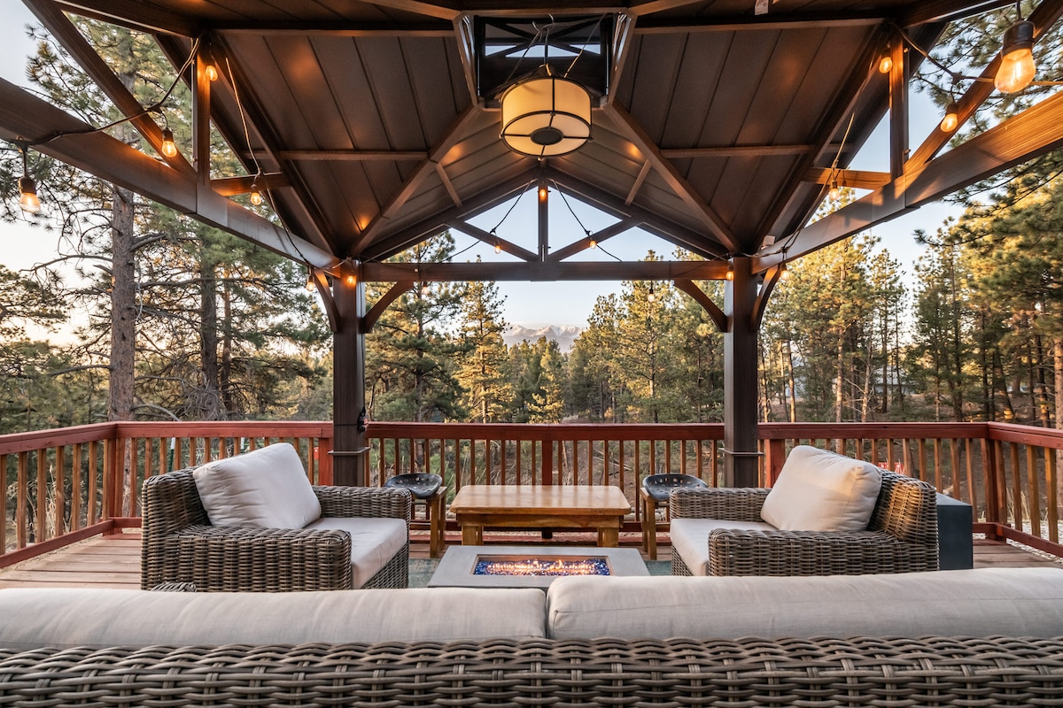 Welcome to your luxurious mountain retreat at Eagle Ridge! The Living Room is a stunning 1400 sf newly renovated home situated in a gated 43-acre property with panoramic views of Pikes Peak that will take your breath away. With a magnificent 1200 sf patio and access to private walking trails, this space has everything you need for a peaceful and rejuvenating vacation or retreat -- a hotel penthouse experience on ground level. The hot tub is filled with fresh water for every guest.