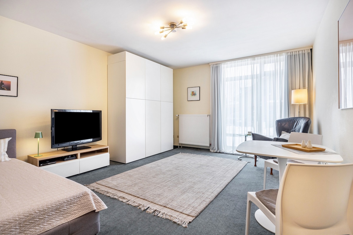El apartamento consta de sala de estar, dormitorio y baño. En el dormitorio hay una cama doble, en la sala de estar un sofá cama (1,20 m de ancho). Está amueblado con muebles de alta calidad y cuenta con un cómodo suelo de corcho. En verano es posible el uso del jardín, hay un aparcamiento y posibilidad de almacenamiento para bicicletas. Vivimos en un pueblo, la A2 se puede llegar en coche en 15 minutos.