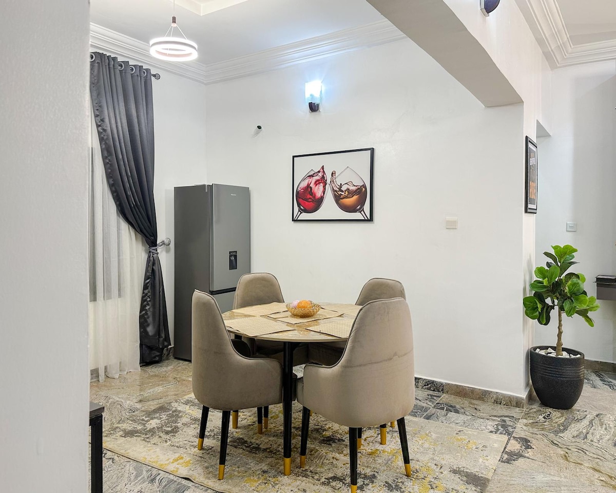 Todo el grupo disfrutará de un fácil acceso desde esta ubicación céntrica de Abuja a todas las partes de la ciudad, por ejemplo, supermercados, centros comerciales y mucho más. Disfrutarás de las increíbles vistas desde tu balcón. Toda la casa tiene capacidad para hasta 6 huéspedes. Los huéspedes pueden disfrutar de la llegada autónoma con una caja de seguridad. La propiedad se encuentra en el distrito central de Abuja, a menos de 1 minuto a pie de los cuarteles legislativos de APO. La propiedad está totalmente energizada con energía solar. Tenemos a nuestro chef residente a tu servicio y servicios de limpieza.