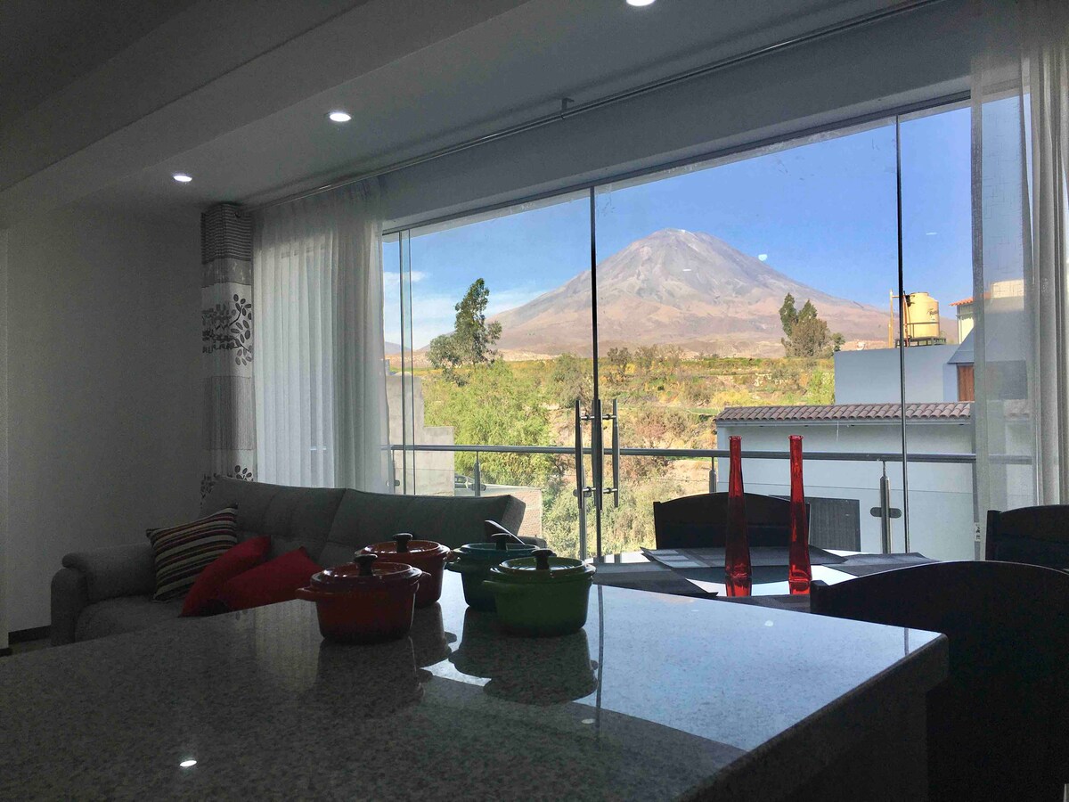 Perfecto departamento para una estadia placentera con acabados de primera y cama king size!!! Vistas panoramicas a un paso del corazón financiero y comercial de Arequipa con seguridad privada. Los principales actractivos de la ciudad estan a pocos minutos caminando como la plaza de Yanahuara y la plaza de Cayma donde podras disfrutar de la mejor gastronomia de la local. Disfruta de una experiencia con estilo en este alojamiento céntrico. Piso 5 edificio familiar sin ascensor.