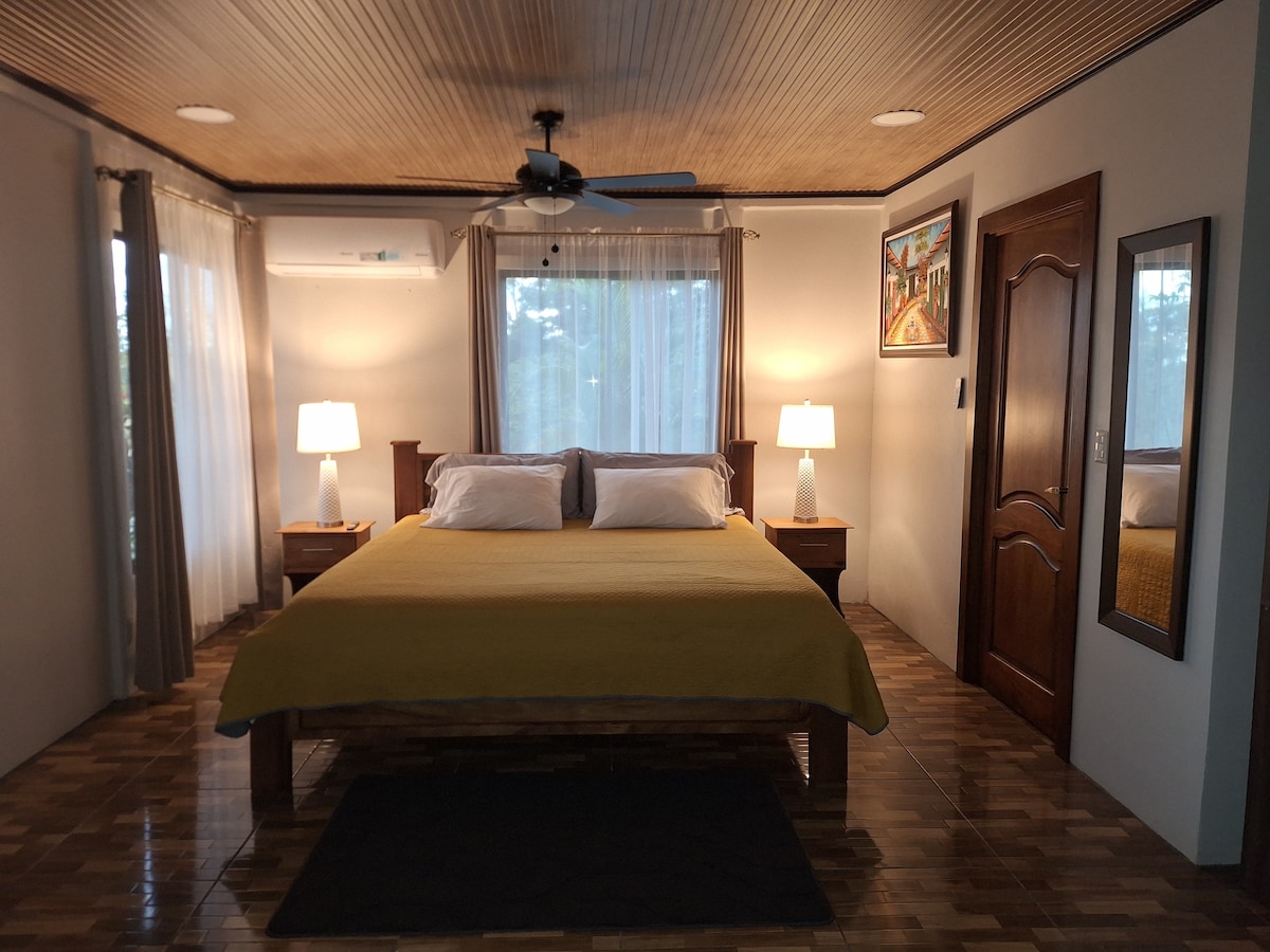 Casa privada. 1 recámara queen, recámara individual, 1 sofá cama, 1 baño completo, agua caliente, cocina. Ventanas muy amplias. Entrada y estacionamiento privados. Aire acondicionado. Wifi potente. Hospédate en un santuario natural privado. ¡Variedad de Ranas! Y animales silvestres, tucanes. Siéntese en el muelle de la laguna, dé un tranquilo paseo por los numerosos senderos del arroyo, disfrute de una emocionante caminata nocturna. Parada perfecta de San José a La Fortuna 702.