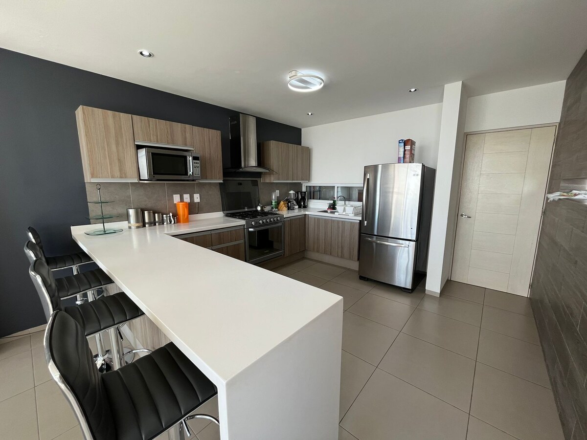 Moderno apartamento de espacios abiertos, cama Queen y sofá cama matrimonial. Con amplia cocina equipada y una espectacular terraza con asador. El apartamento se encuentra en una zona de alta seguridad. Campo de golf público, áreas para ejercitarse, hermosos jardines y plazas comerciales. Un espacio cómodo, tranquilo y armonioso donde se podrá disfrutar de agradables momentos en familia. A solo 5 minutos en auto de la universidad Anáhuac, ideal para estudiantes, ejecutivos o vacacionistas.