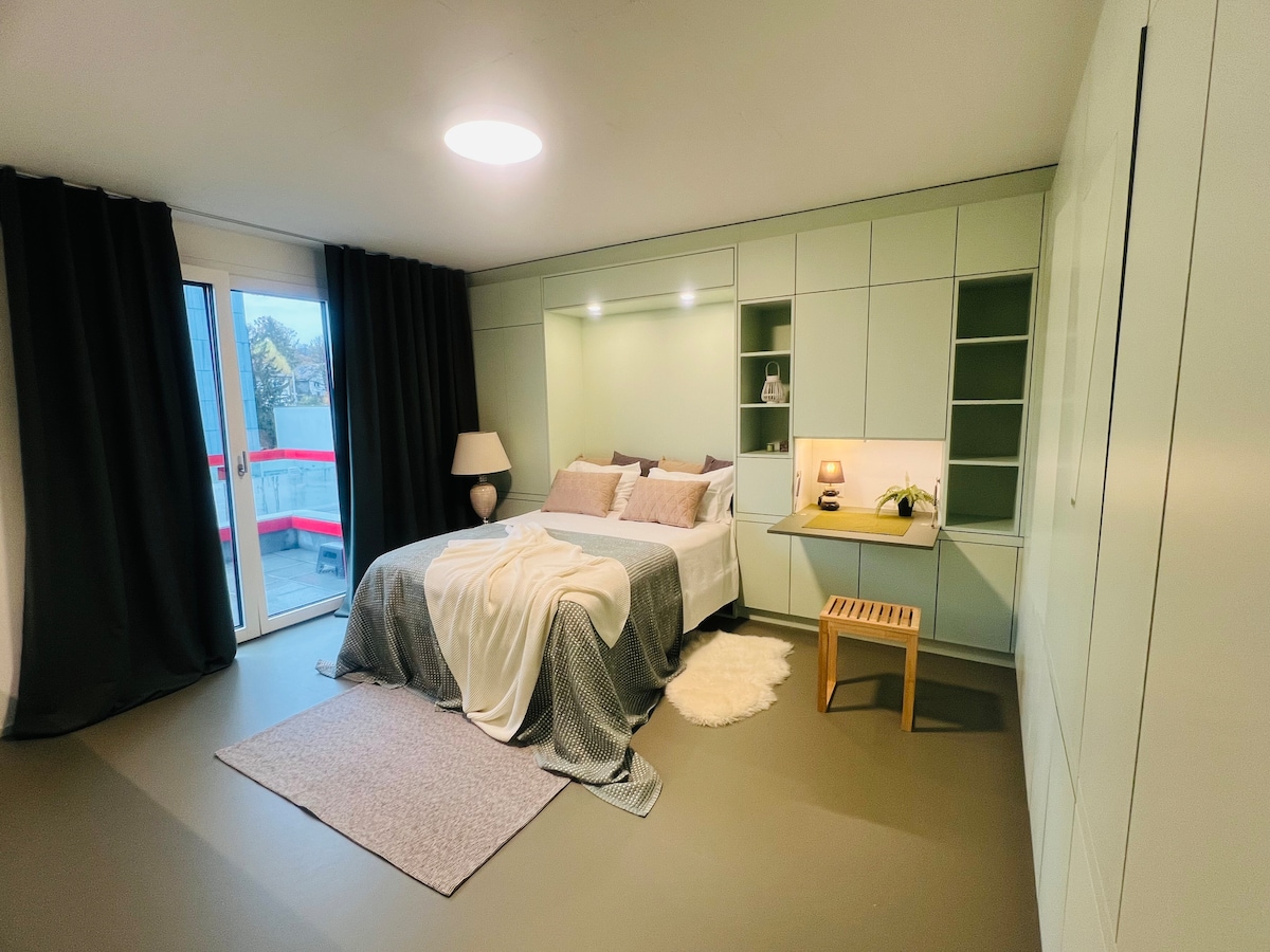 Unser Apartment besticht durch top-modernes Design: Bad mit Regendusche, Handtuchwärmer u. exklusiven Armaturen. Fischgrätparkett schafft eine stilvolle Atmosphäre. Küche mit High-End-Geräten (Bora, V-Zug, Spülmaschine, Waschmaschine/Trockner). Balkon ist gross, ruhig gelegen, bietet viel Privatsphäre und eine schöne Aussicht. Philips HUE Lampen für stimmungsvolles Licht. Ein Samsung The Frame verwandelt den Raum in eine Kunstgalerie. Das komfortable Bett rundet das Angebot zum Wohlfühlen ab!